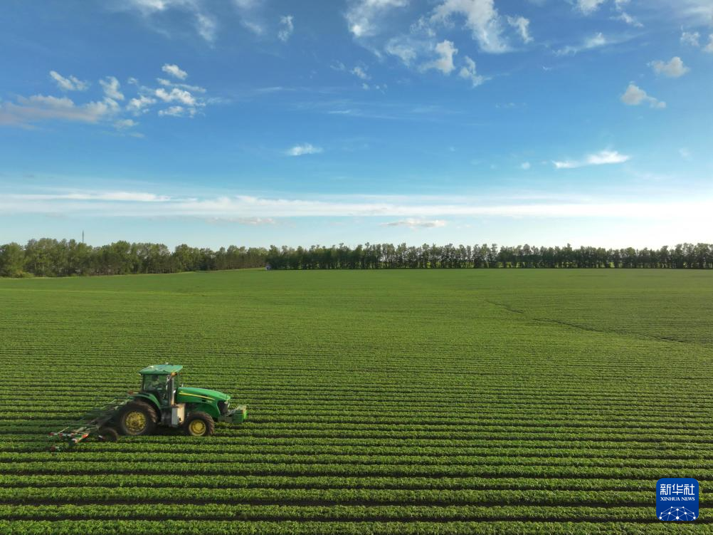 6月24日,农机在北大荒集团荣军农场有限公司第四管理区的一块大豆地进行中耕作业(无人机照片)。