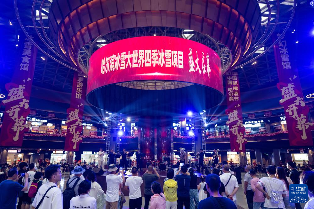 7月6日,市民游客在哈尔滨冰雪大世界园区内观看表演。