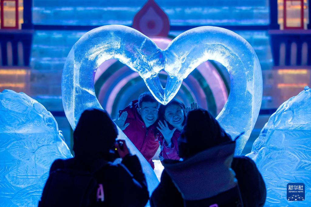 7月6日,游客在哈尔滨冰雪大世界室内冰雪馆内拍照留念。