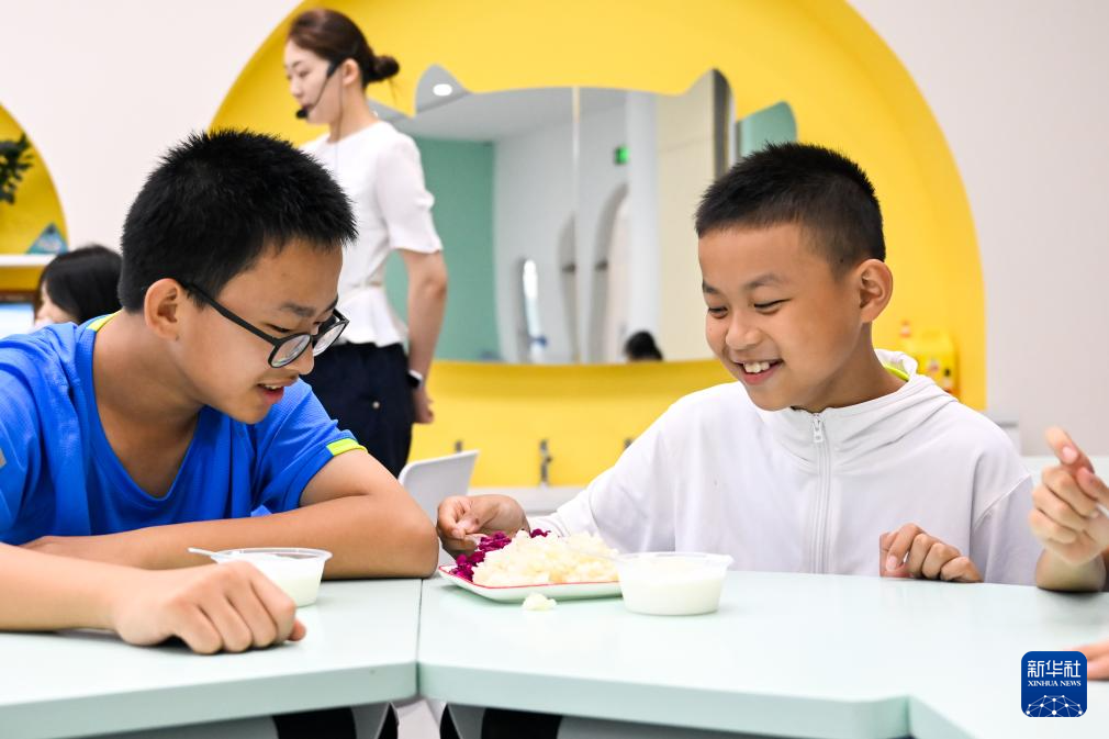 7月25日,参加研学活动的青少年在呼和浩特市伊利健康谷景区体验酸奶制作。