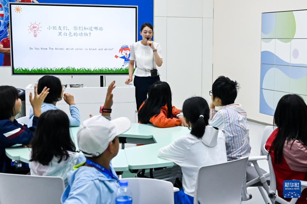 7月25日,工作人员在呼和浩特市伊利健康谷景区为参加研学活动的青少年讲解。
