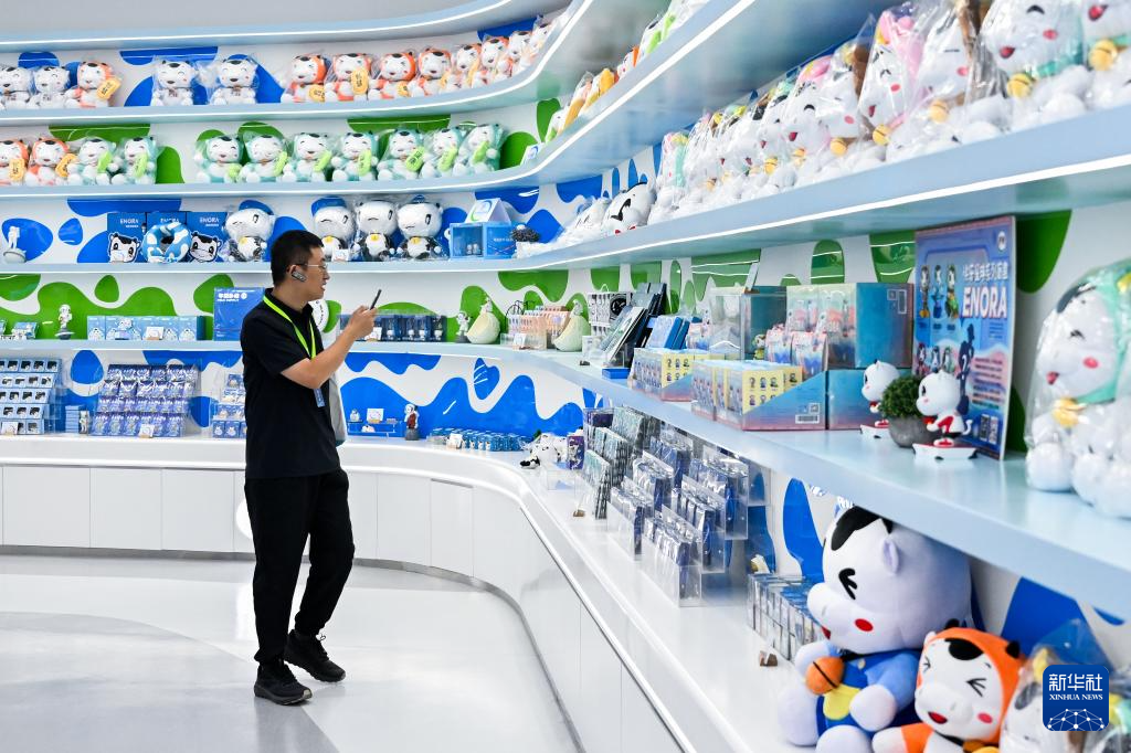 7月25日,游客在呼和浩特市伊利健康谷景区观看文创产品。