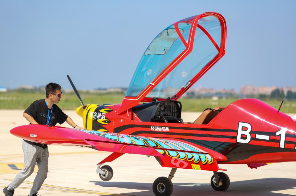 7月30日,在位于山东莱西市店埠镇的青岛莱西通航产业园,飞行员顾兆一在移动飞机。