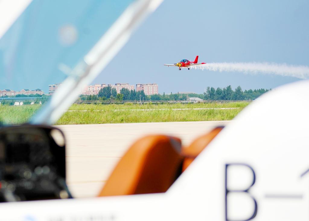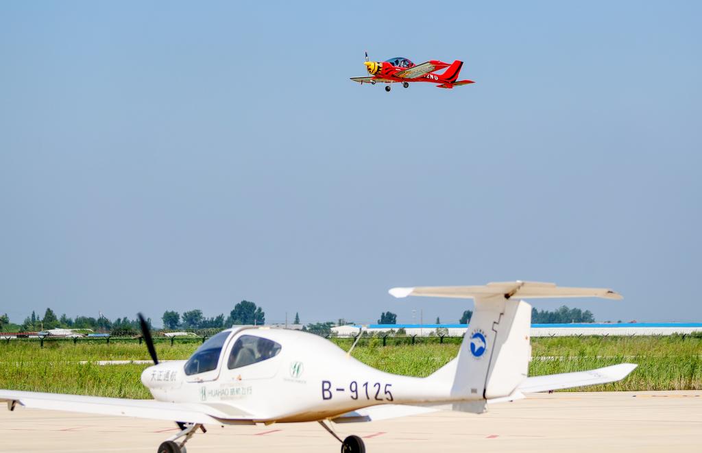 7月30日,在位于山东莱西市店埠镇的青岛莱西通航产业园,飞行员带领飞行爱好者体验驾驶轻型运动飞机。