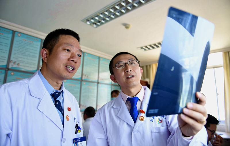 在拉萨市人民医院骨科病房,北京积水潭医院的援藏医生龚晓峰(右)和北京天坛医院援藏医生李家谋查看患者的X光片(2017年8月3日摄)。新华社记者 晋美多吉 摄
