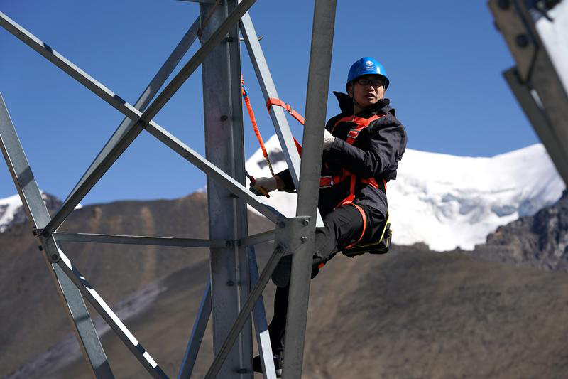在西藏山南市洛扎县,国家电网安徽省电力有限公司援藏工作人员徐四勤在浪洛线197号铁塔进行线路巡视(2020年11月4日摄)。新华社记者 詹彦 摄