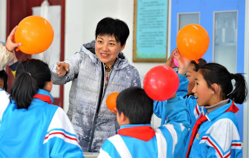 在拉萨市实验小学科学教室,来自陕西师范大学附属小学的援藏教师邢悦指导五年级学生进行“奇妙的静电”实验(2017年11月29日摄)。新华社记者 张汝锋 摄