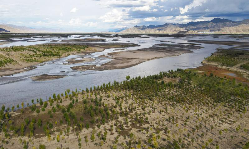 雅鲁藏布江沿线日喀则市境内河岸两旁绿意盎然(2020年9月4日摄,无人机照片)。新华社发(索朗罗布 摄)