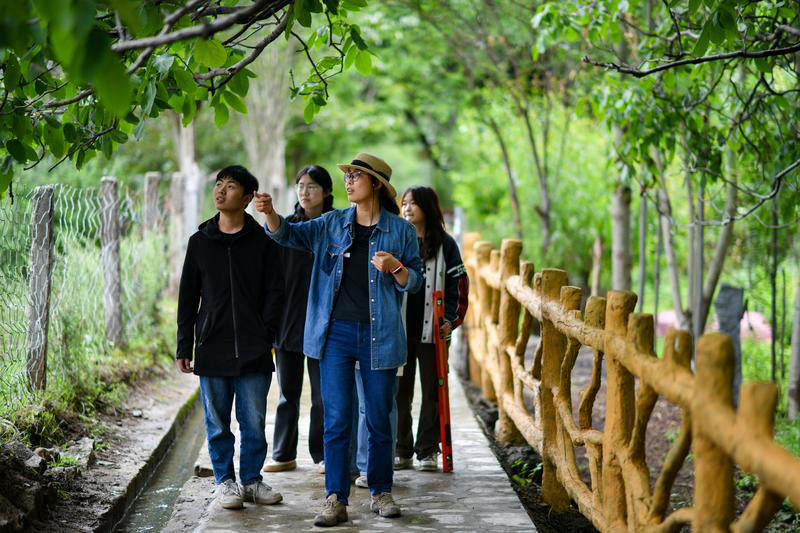 长江大学核桃科技特派团的刘利平博士(前)在加查县安绕镇热果村古核桃树下给学生开展现场教学(2023年7月27日摄)。长江大学核桃科技特派团在西藏山南市加查县创建核桃研究所,刘利平博士是团队的一员,主导实施了高原核桃产业技术研究项目的大部分工作。新华社记者 姜帆 摄