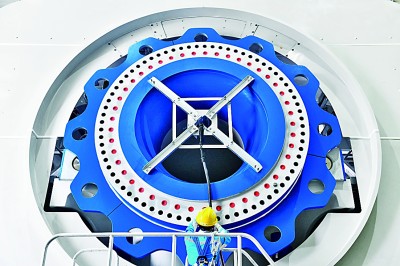 在山东乳山远景能源零碳产业园,工作人员在海上风机前作业。