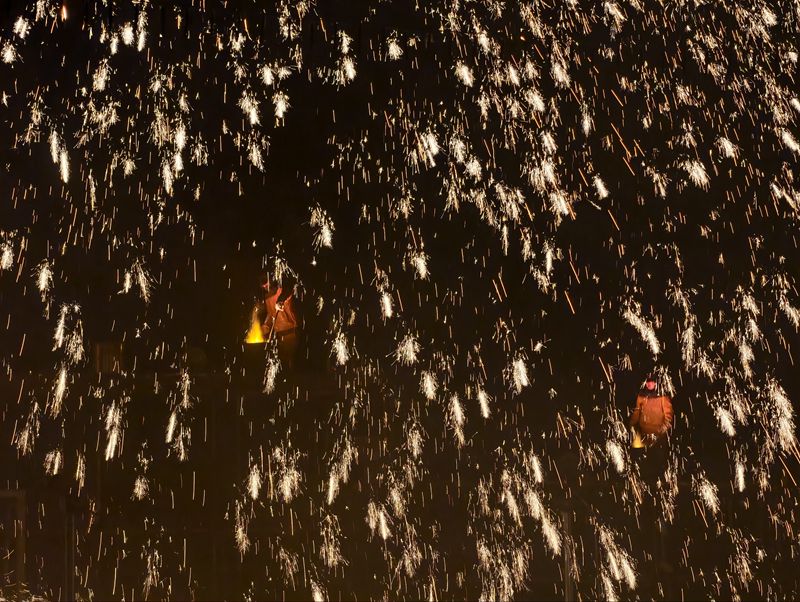 2月2日,辽宁省沈阳市和平湾新春灯会,国家级非遗表演打铁花。新华网记者钟奕摄