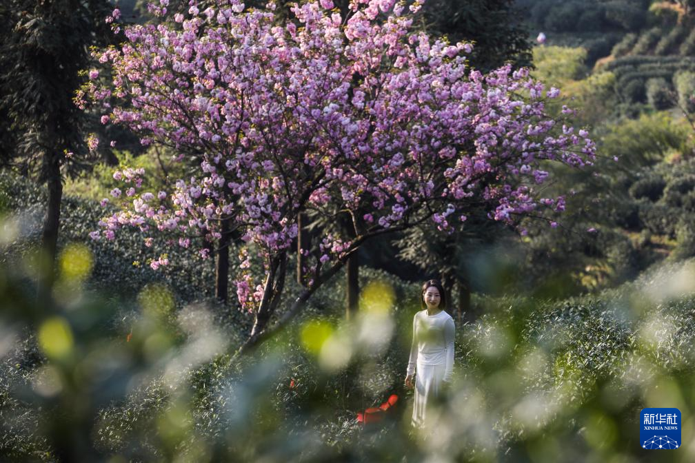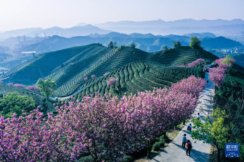 近期,浙江省杭州市富阳区富春街道拔山村万亩茶山上的樱花树进入盛花期,沿着蜿蜒的茶园登山道,千株晚樱错落分布在茶园各处,“间株樱花间株茶”的美景徐徐展开。