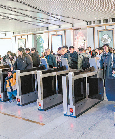 近日,“水韵江苏”主题旅游列车首发,开启了春天环游江苏的序幕。该旅游列车分A、B线,A线由南通站至上海虹桥站往返,B线由上海站至徐州东站往返。图为在扬州东站,游客检票乘坐“水韵江苏”旅游列车。任 飞摄(人民视觉)