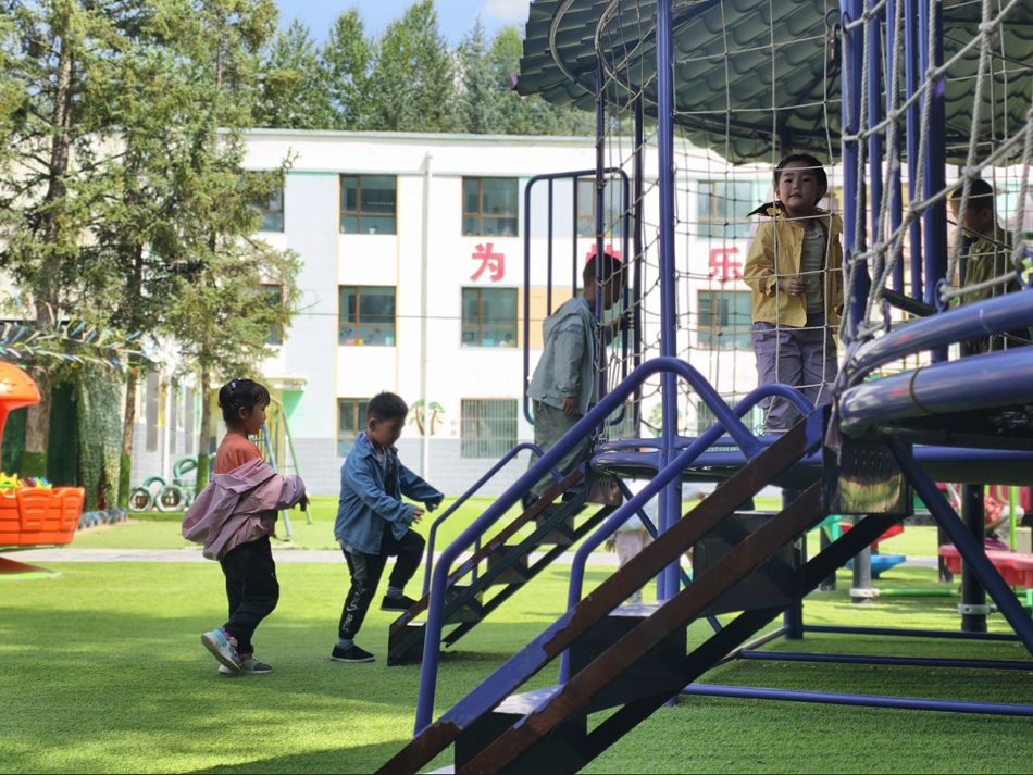 7月11日,青海省西宁市湟中区共和镇苏尔吉村幼儿园,小朋友们正在玩游戏。新华网记者 钟奕 摄