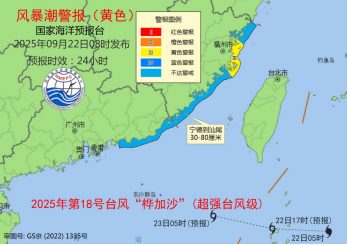 风暴潮方面,受今年第18号台风“桦加沙”(超强台风级)的影响,预计9月22日下午至23日下午,福建宁德到广东汕尾将出现50到120厘米的风暴增水。福建省漳州市的风暴潮预警级别为橙色,福建省福州市的风暴潮预警级别为黄色,福建省莆田市、泉州市、厦门市,广东省潮州市和汕头市的风暴潮预警级别为蓝色。请沿海政府及相关部门按照职责做好防御风暴潮的应急抢险工作;组织各类船只回港避风,加固沿海渔业养殖水产设施和渔港设施,相关海上作业人员及时撤离;关闭沿海危险区域浴场和游乐设施,禁止人员到海边游玩;加强沿海海堤、水闸等设施的巡查,薄弱地区和危险地区的海堤及时加固除险,必要时,相关人员撤离转移到安全地带。