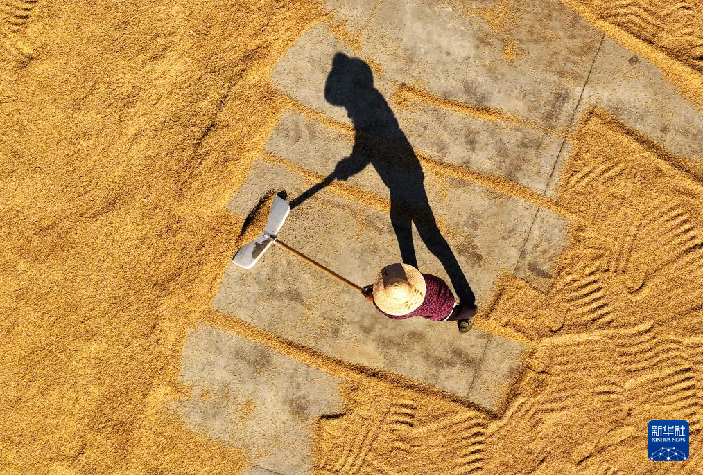 10月22日,农民在江苏里下河地区农科所(扬州市农科院)晾晒稻谷(无人机照片)。
