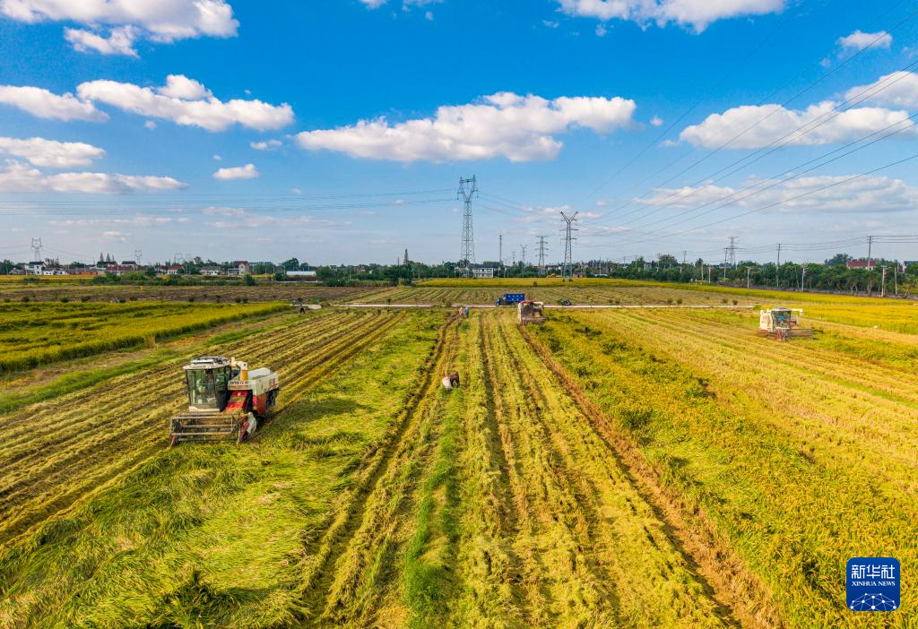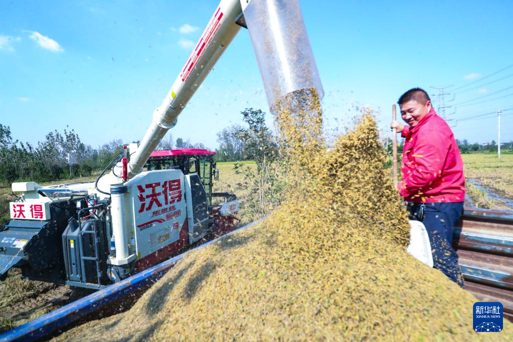 10月22日,农民在河南省信阳市光山县罗陈乡张楼村抢收水稻。