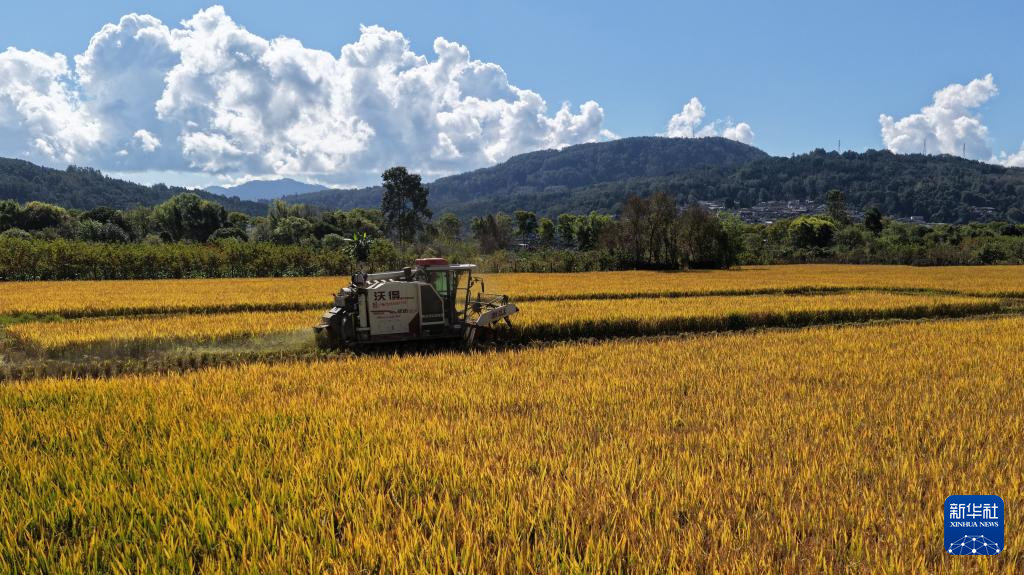 10月22日,云南腾冲市和顺镇大庄村农民驾驶农机收割水稻(无人机照片)。