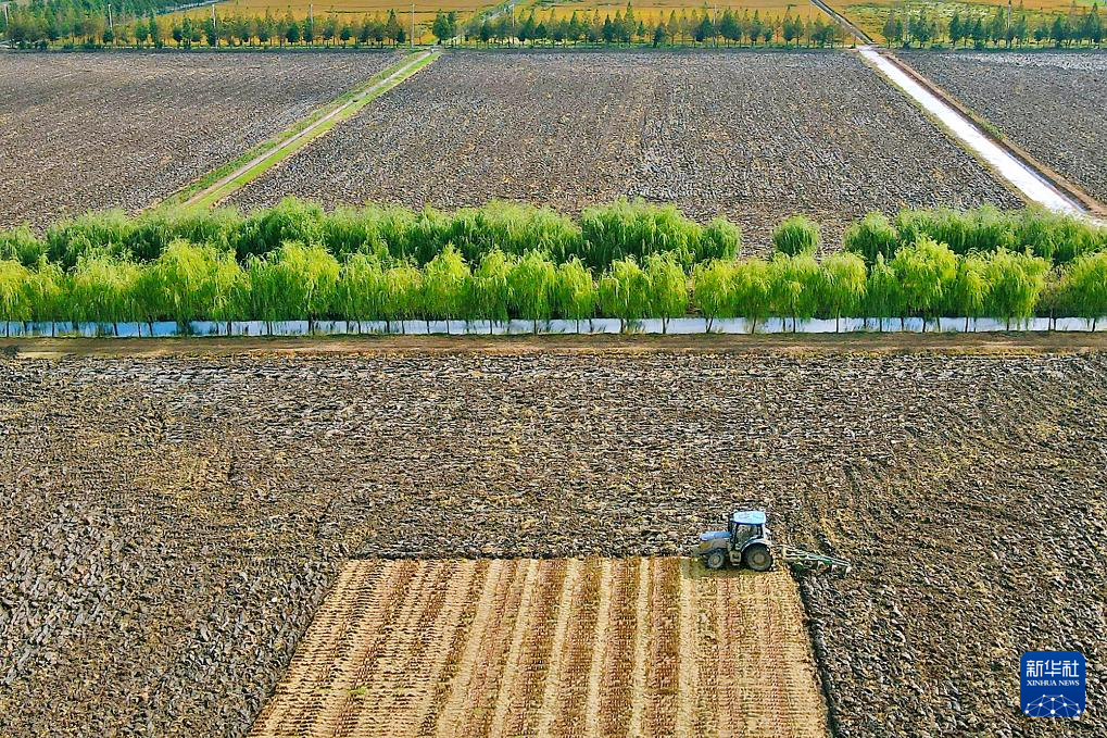 10月22日,在江苏省如皋市城北街道平园池村“稻油轮作”基地,农民驾驶农机对收割后的稻田进行耕地作业,为栽种油菜做准备(无人机照片)。