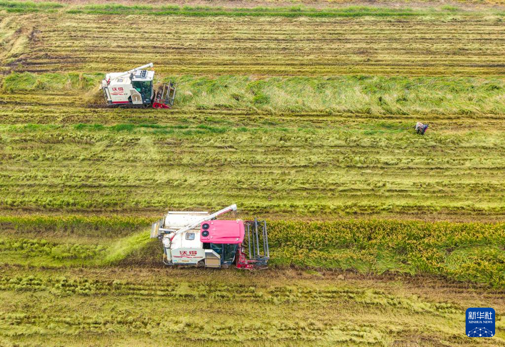 10月22日,在江苏省扬州市江都区邵伯镇孙桥村,农民在收割水稻(无人机照片)。