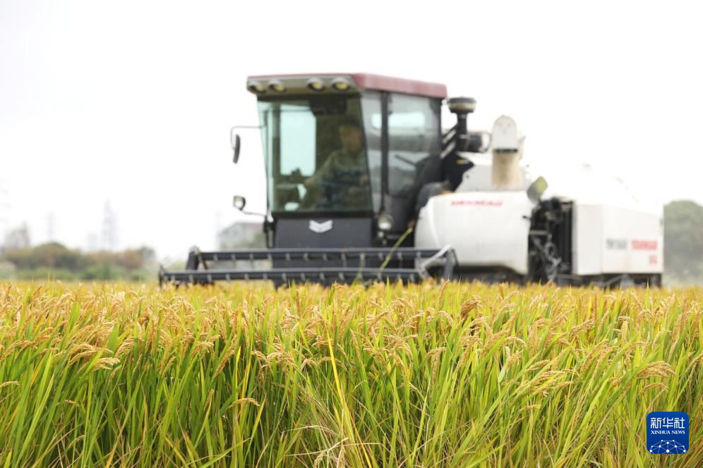 10月22日,在浙江省嘉兴市南湖区凤桥镇星火村,农机手驾驶收割机收割水稻。