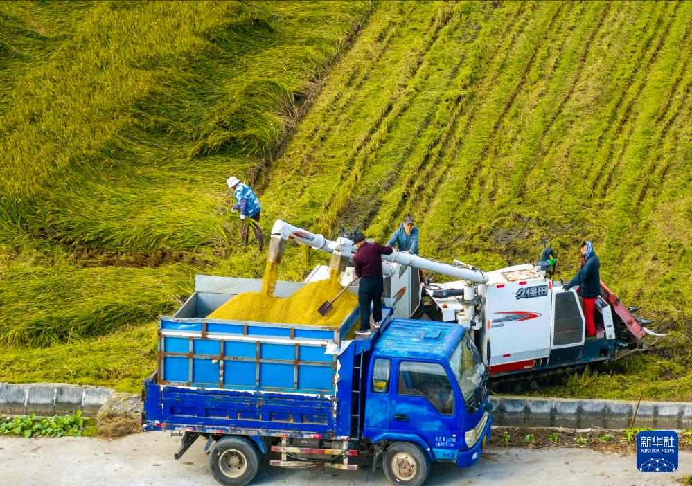 10月22日,在四川省达州市大竹县石桥铺镇长青村的稻田间,农机手将收获的水稻装入运粮车。