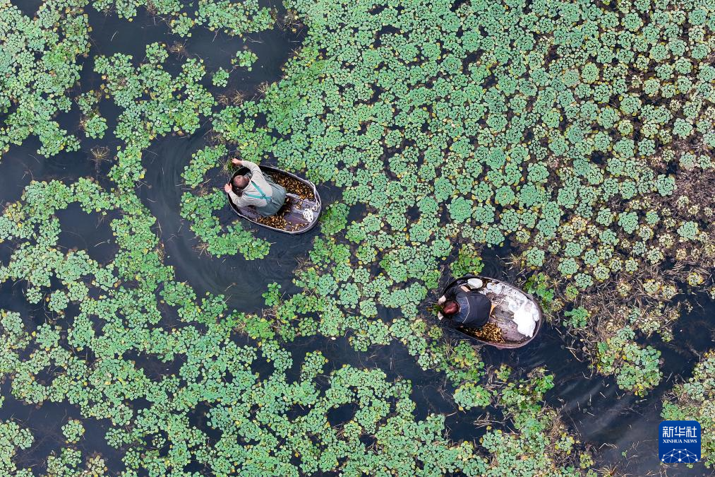 10月22日,浙江省湖州市吴兴区东林镇泉心村村民划着菱桶采摘菱角(无人机照片)。