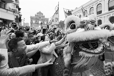 2月17日,舞狮队伍在澳门大三巴牌坊前与市民互动。新华社发(张金加 摄)