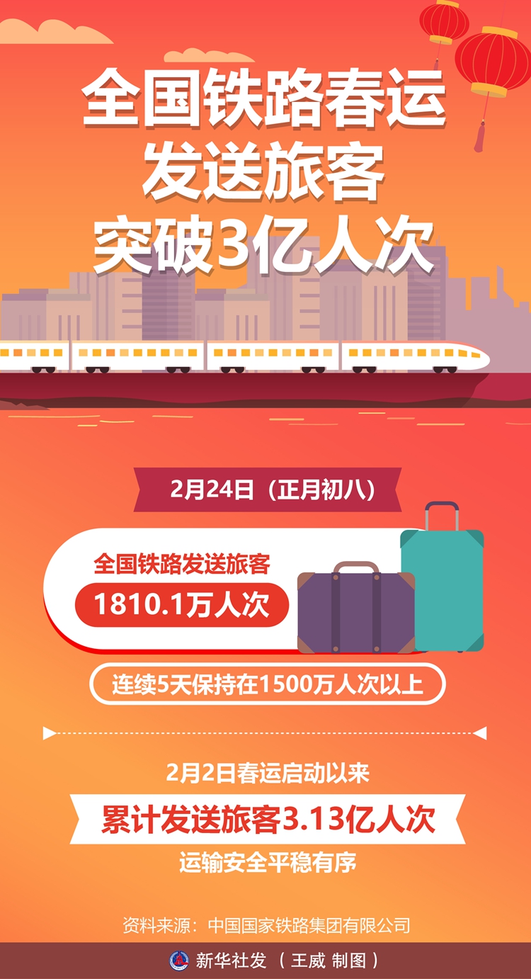 新华社北京2月25日电(记者樊曦)记者2月25日从中国国家铁路集团有限公司获悉,2月24日(正月初八),全国铁路发送旅客1810.1万人次,连续5天保持在1500万人次以上,2月2日春运启动以来累计发送旅客3.13亿人次,运输安全平稳有序。2月25日(正月初九),全国铁路预计发送旅客1665万人次,计划加开旅客列车1549列。