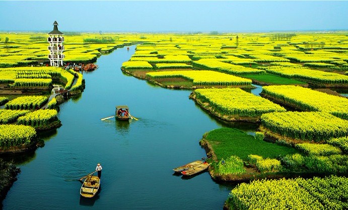 江苏兴化市缸顾乡的20万亩油菜花在每年的清明前后进入盛开期,以千岛样式形成的垛田景观享誉全国。据考证,750年前,缸顾乡农民在水中取土堆田,整齐如垛,并在上面种植农作物,才演变成现今的生态景致。每年清明前后,油菜花开,蓝天、碧水、“金岛”织就了“河有万湾多碧水,田无一垛不黄花”的绚丽画面。泛舟其中,如入迷宫,令人流连忘返,心旷神怡。