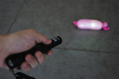 近日,记者检测用激光笔是否能打爆气球。当气球吹得半满时,激光笔照射5分钟并没有将其打爆。但将气球吹到最大,打开激光笔时气球瞬间被打爆。新京报记者 薛珺 摄