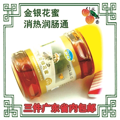 “国产”金银花蜜同样宣称具有降火清热的功效,如“从城荔香特产店”所售的“蜂唛”牌“金银花蜜”,在产品特点中提道,“金银花蜜,清热解毒,泻火,清泻心肝胃火,有效预防感冒。”