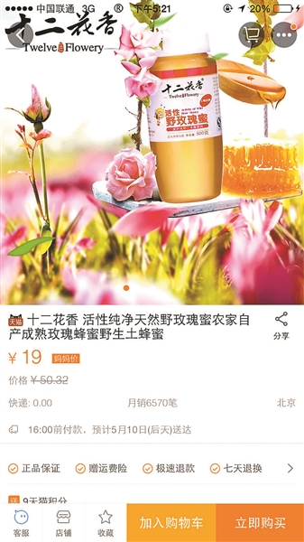 在产品描述中可以看到,店主称“玫瑰蜜”具有美容滋补等功效。原产地为黑龙江伊春,是厂家专养的土蜜蜂采伊春的野玫瑰所得,发货地则为河北廊坊。北青报记者询问客服“玫瑰蜜”的取蜜制作流程,客服称:“我们所出售的野玫瑰蜜不是家养的玫瑰花,而是野生的蔷薇,俗称‘野玫瑰’。”此外,客服强调:“我们的产品是纯正的野玫瑰花土蜂蜜,有淡淡的花香味,具有美白嫩肤,香体安神的效果。”