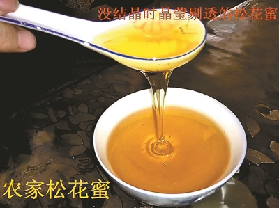 “松花蜜”似乎更加原生态,简易塑料包装,无标签无商标。“丽芳土特产”店所售的500g罐装“松花蜜”售价为79.9元,店主介绍说是未经加工自己罐装的,该蜜产自甘肃陇南徽县,是直接采的松树的花蜜,有股苦味。“杜培大大”、“农家药材小铺”店也是同样的情况,500g树洞松花蜜罐装售价64至67元,也是简易塑料包装没有标签。