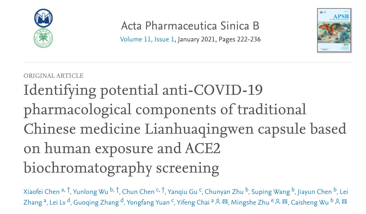 该研究作者为厦门大学药学院吴彩胜副教授、海军军医大学柴逸峰教授团队等,研究成果《基于人体暴露和ACE2生物色谱筛选中药连花清瘟胶囊的抗COVID -19药理活性成分》在药学顶级期刊《药学学报》发表。