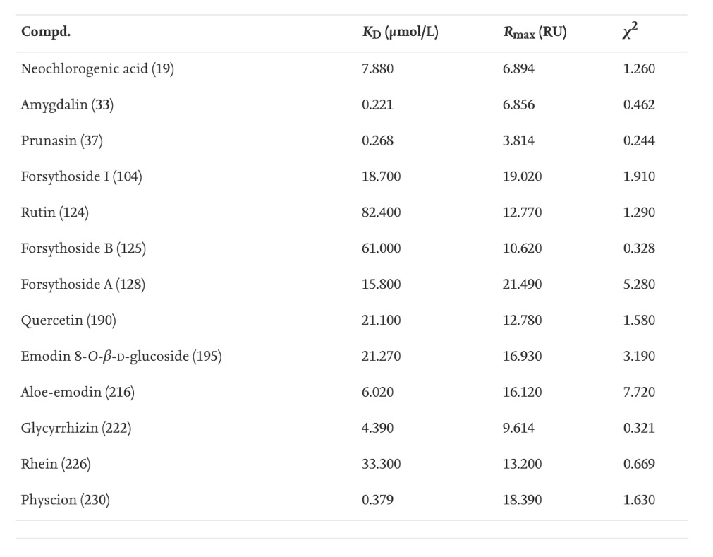 连翘苷A(forsythoside A)和连翘苷I(forsythoside I)是连翘果实中的主要成分,其对ACE2的亲和力被分别测定为15.8 and 18.7 μmol/L。大黄酸(rhein)是另一种在人血清中高暴露的组分,它对ACE2的亲和力适中,KD值为33.3 μmol/L.。