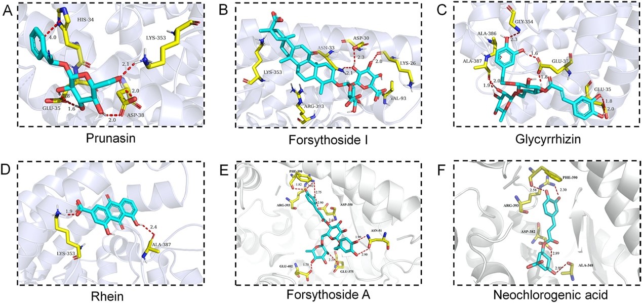 图2.(A)野黑樱苷、(B)连翘苷I、(C)甘草甜素、(D)大黄酸、(E)连翘苷A、(F)新绿原酸的分子对接结果。 论文附图