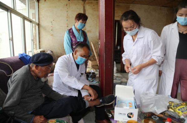 在青海省西宁市朔北藏族乡阿家堡村卫生室,医生赵铭邦正在为最后一位腿疼的患者扎针。从上午9点多,赵铭邦就开始诊脉、开药、扎针、贴敷……卫生室其他工作人员忙着给居民免费检测“幽门螺旋杆菌”,并发药、贴敷。