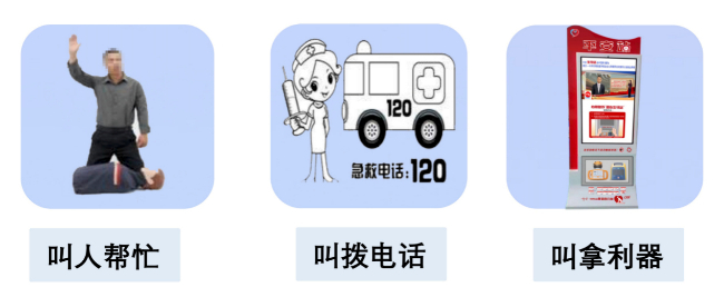叫拿利器:请某某先生/女士,协助寻找AED、腹部提压心肺复苏仪(AACD-CPR)
