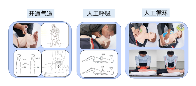 开通气道(airway,A):通常采用仰头抬颏法,对于怀疑有头、颈部创伤患者采用托颌法打开气道,同时清除病人口腔、鼻腔内的上呼吸道异物;运用腹部提压心肺复苏仪吸附于心搏骤停患者中上腹部,连续3-5次快速向内向上按压(40-50 kg),产生海姆立克效应,实现畅通上下呼吸道。