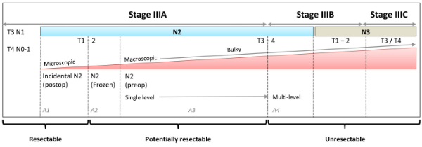 首先,目前公认的是,IIIA-N2期肺癌具体治疗方案应由包含外科、肿瘤内科和放疗科医生在内的多学科团队讨论(MDT)决定。从治疗角度看,IIIA-N2期肺癌具有高度的异质性,也就是说同是IIIA期,病人与病人之间的情况却并很不一样,治疗方案区别很大。如下图,IIIA期包括了术前未见淋巴结肿大、术后偶然发现的N2淋巴结转移,到单站N2转移,再到多站广泛N2转移。因此,即使是简单的ⅢA-N2期,其概念也仍然太过宽泛,需要把ⅢA-N2再分类。