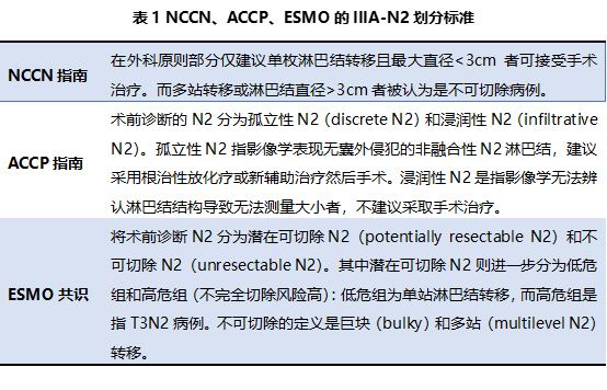 然而,IIIA-N2再分类目前没有统一标准。美国国立综合癌症网络(NCCN)、美国胸科医师学院(ACCP)与欧洲肿瘤内科学会(ESMO)指南/共识的划分标准有所不同(表1)。术前确诊的ⅢA-N2期,其治疗策略取决于N2的受累程度及是否“可切除(resectable)”。虽然不同指南或共识的具体标准不同,但总体上建议类似:对于巨块、多站或呈融合浸润状态的N2淋巴结转移,预期无法根治性切除,推荐同步放化疗+免疫治疗巩固,手术不作为主要治疗手段。其依据是有诸多不足和争议的EORTC 08941研究,主要结论是无法完整切除的N2期NSCLC经过新辅助化疗后仍难以完全切除(完全切除率仅50%),手术效果甚至不能比单纯放疗更有优势。