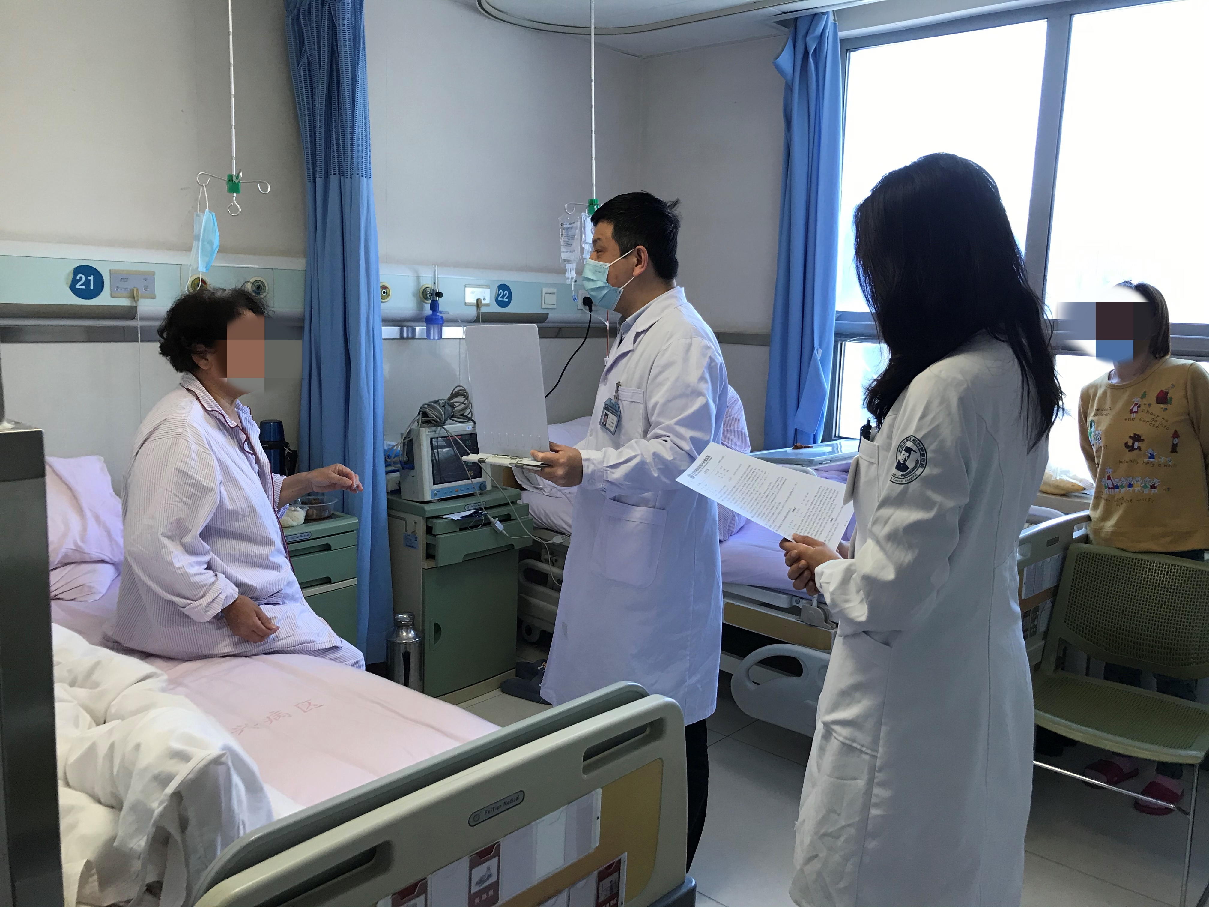 来到一位患者床位前,马飞对其进行仔细检查。这位患者患有双侧乳腺癌,是一位BRCA1基因突变的三阴性乳腺癌患者,考虑到患者的肿瘤情况,马飞为其调整了化疗方案。但患者考虑到自身携带的遗传性BRCA1基因突变,该患者十分担心会遗传给自己的女儿,向马飞袒露了自己的顾忌。