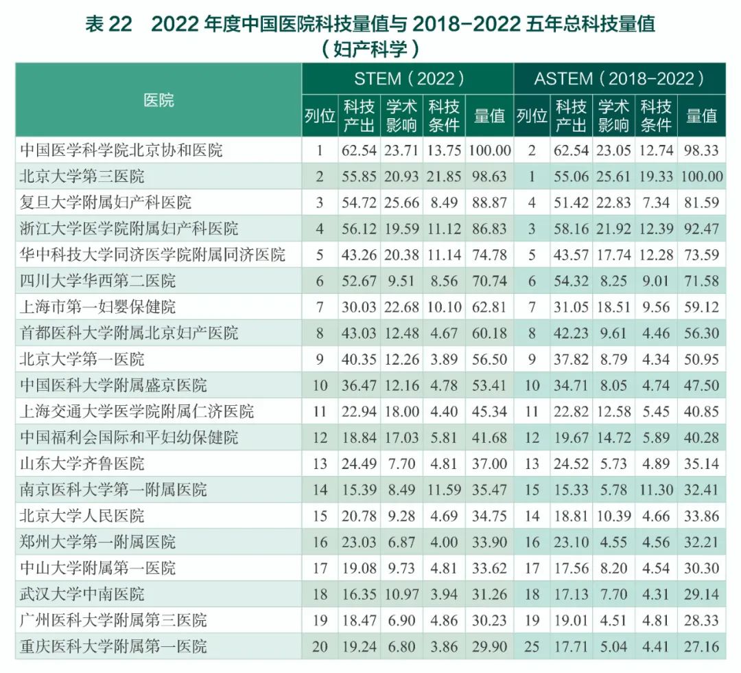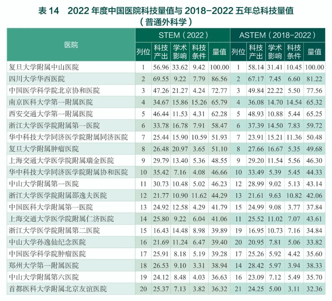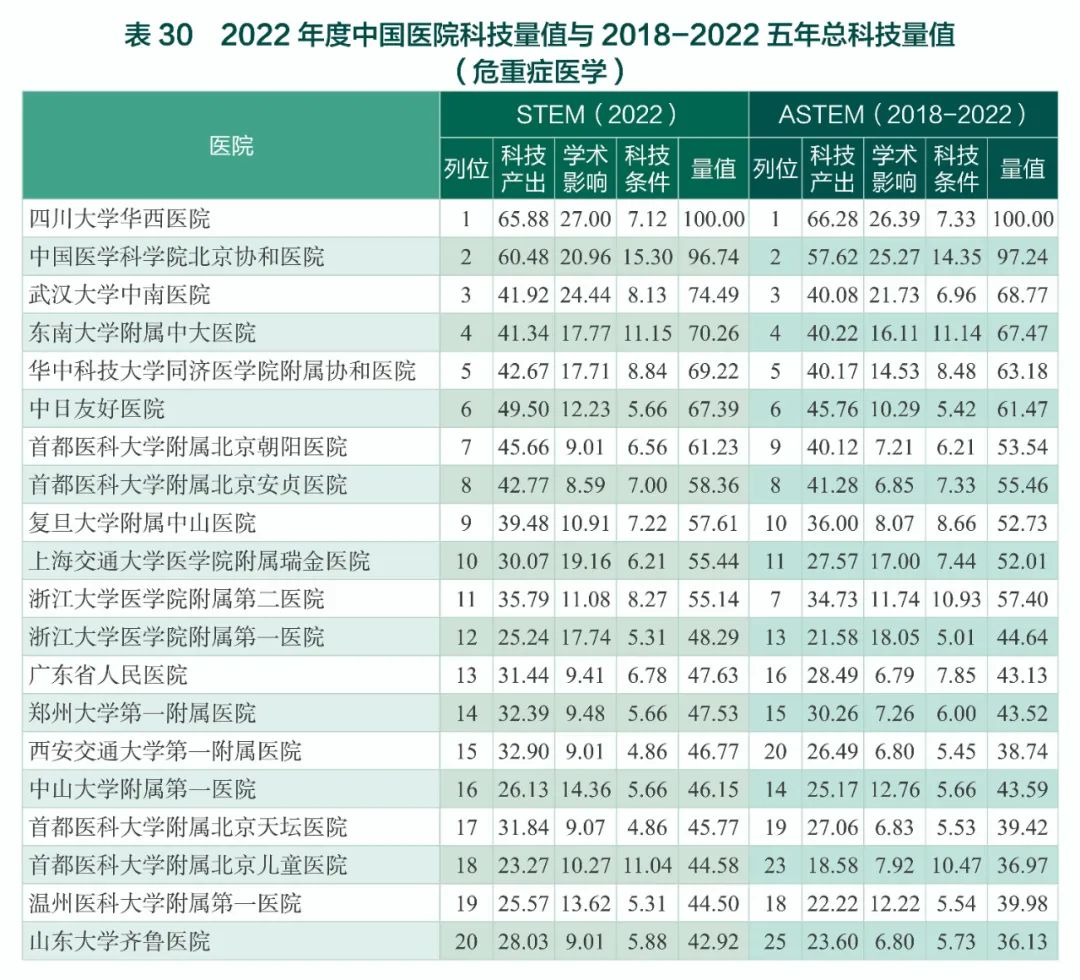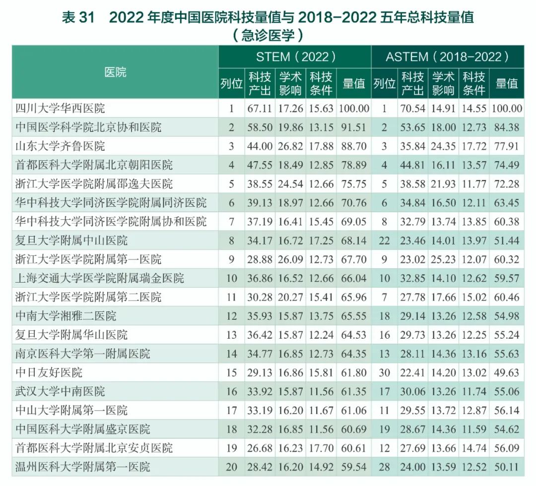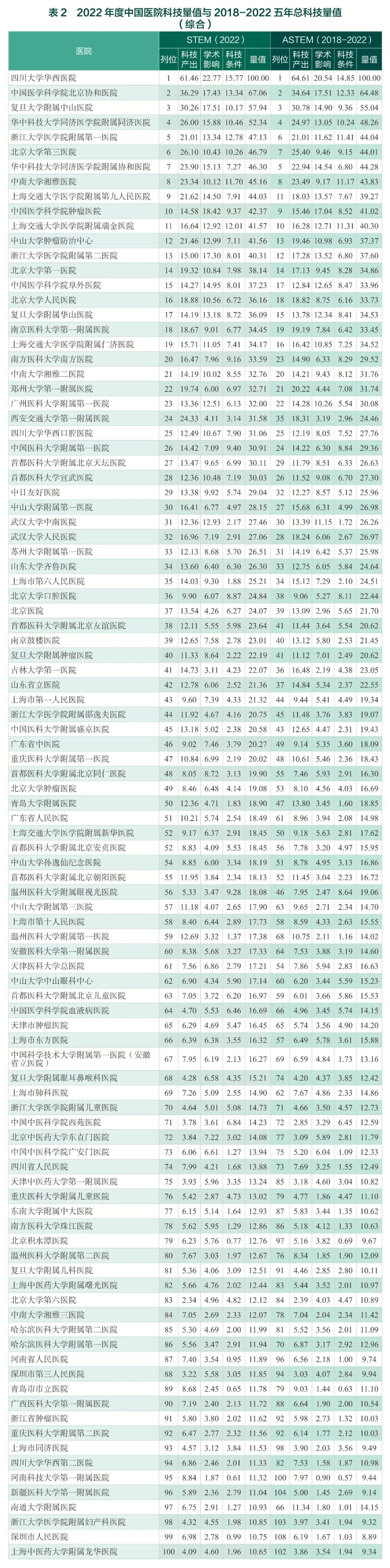 2022年度中国医院科技量值研究对象覆盖全国1,644家三级医院,此次发布综合及31个学科前100位医院。综合科技量值列位前10的医院分别是:四川大学华西医院、中国医学科学院北京协和医院、复旦大学附属中山医院、华中科技大学同济医学院附属同济医院、浙江大学医学院附属第一医院、北京大学第三医院、华中科技大学同济医学院附属协和医院、中南大学湘雅医院、上海交通大学医学院附属第九人民医院、中国医学科学院肿瘤医院。