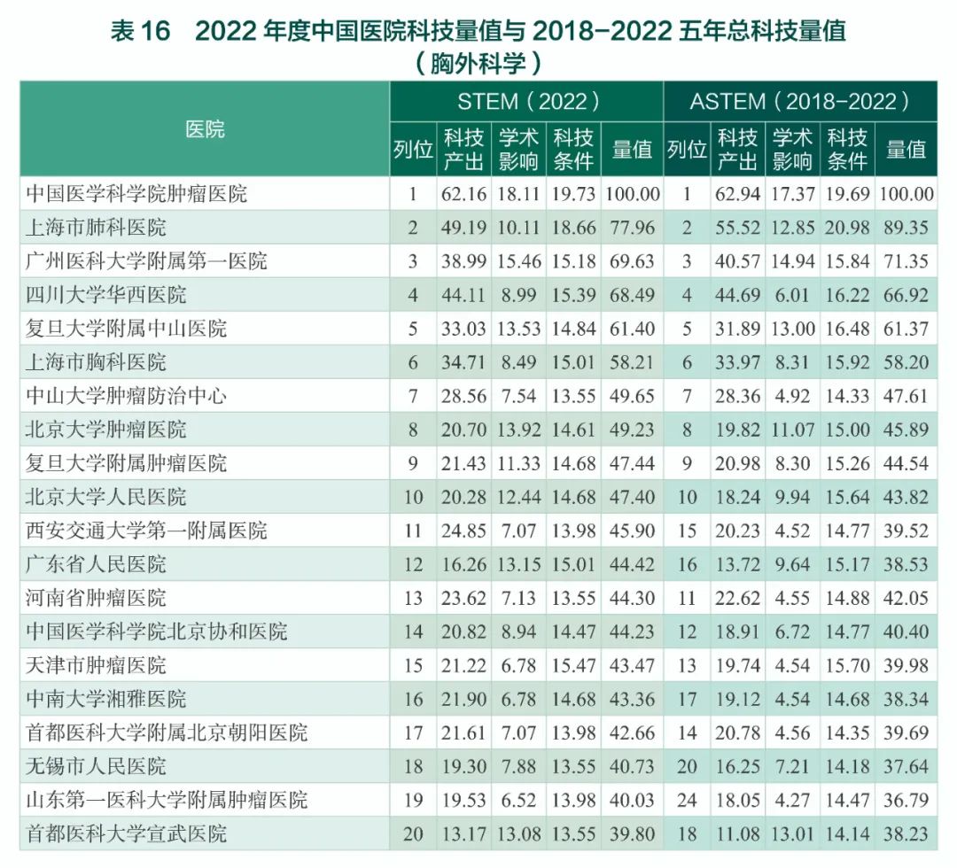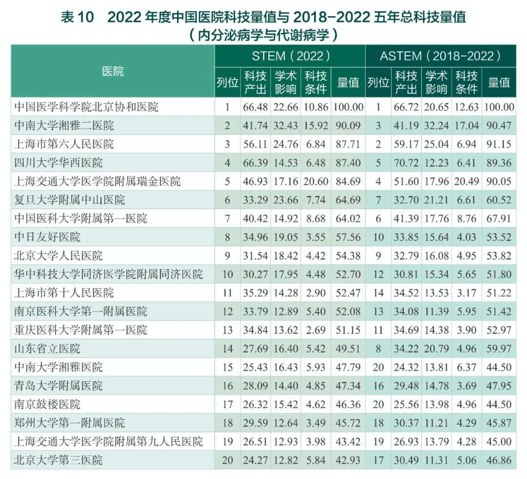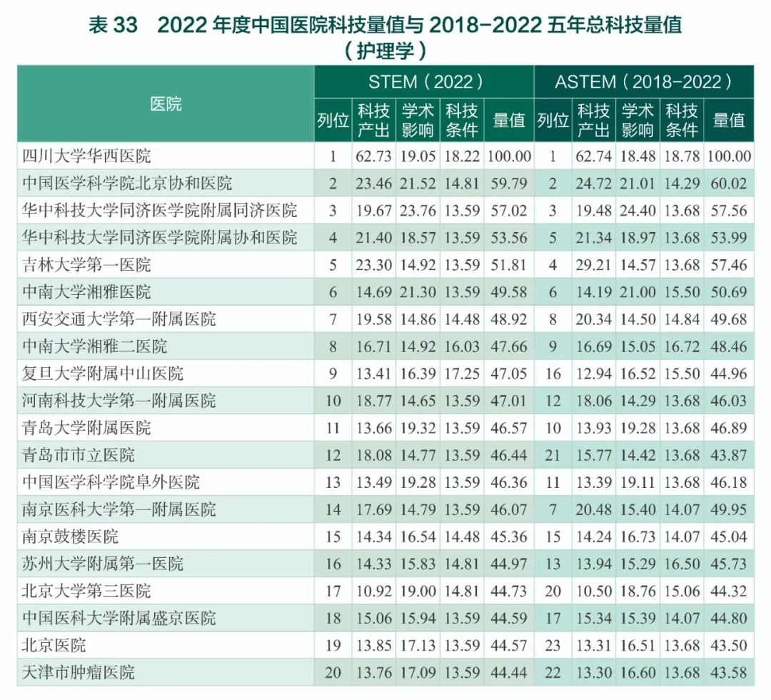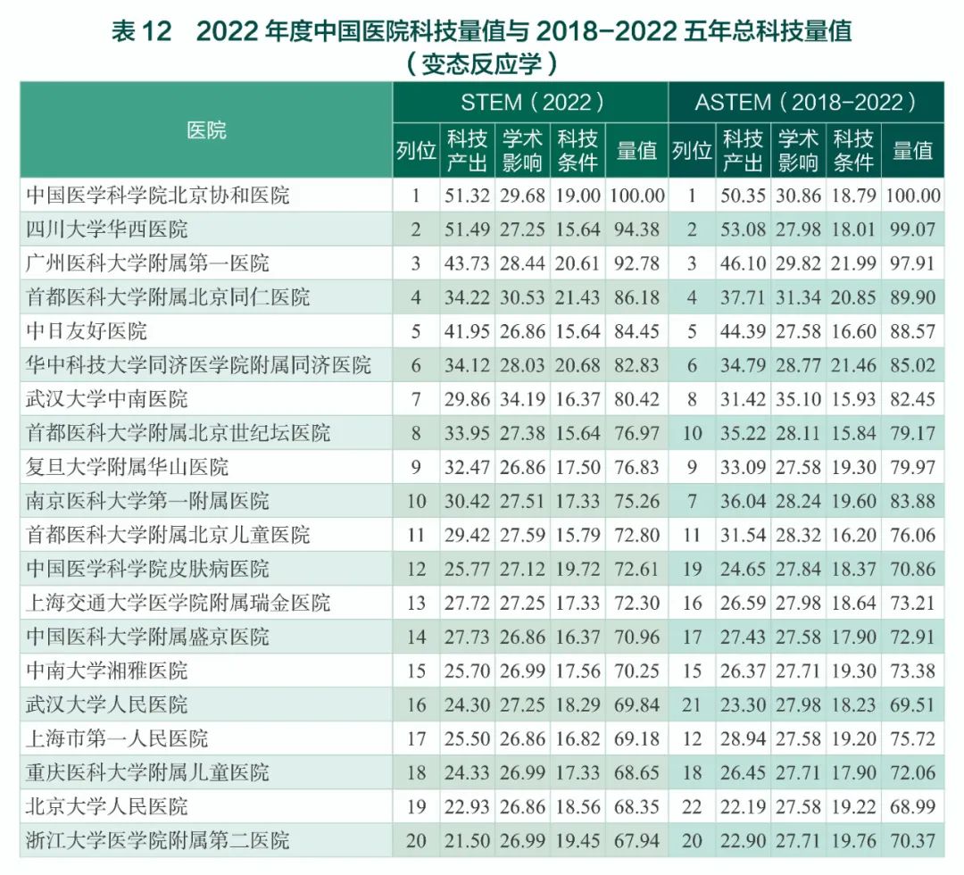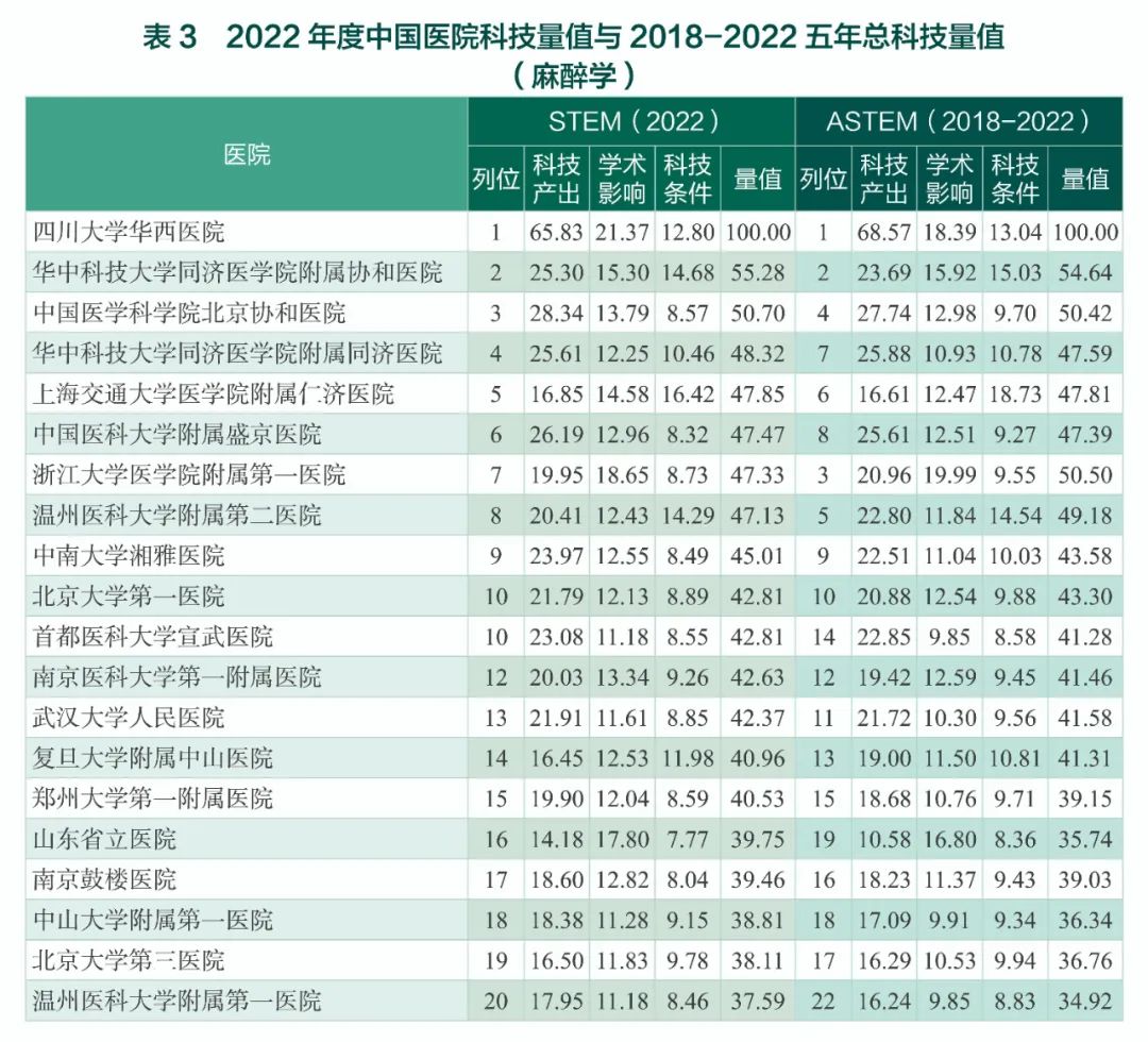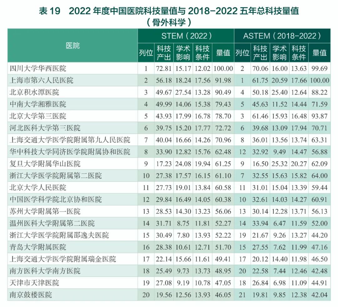2022年度中国医院科技量值研究对象覆盖全国1,644家三级医院,此次发布综合及31个学科前100位医院。综合科技量值列位前10的医院分别是:四川大学华西医院、中国医学科学院北京协和医院、复旦大学附属中山医院、华中科技大学同济医学院附属同济医院、浙江大学医学院附属第一医院、北京大学第三医院、华中科技大学同济医学院附属协和医院、中南大学湘雅医院、上海交通大学医学院附属第九人民医院、中国医学科学院肿瘤医院。