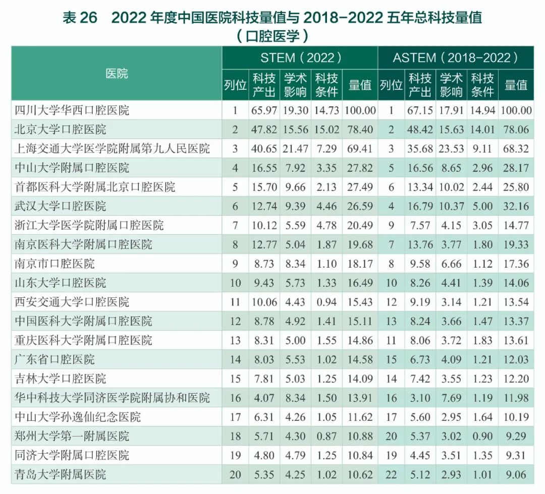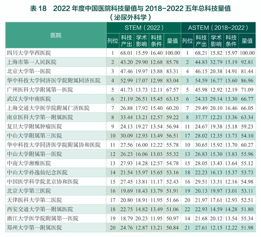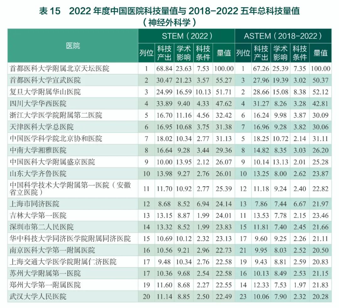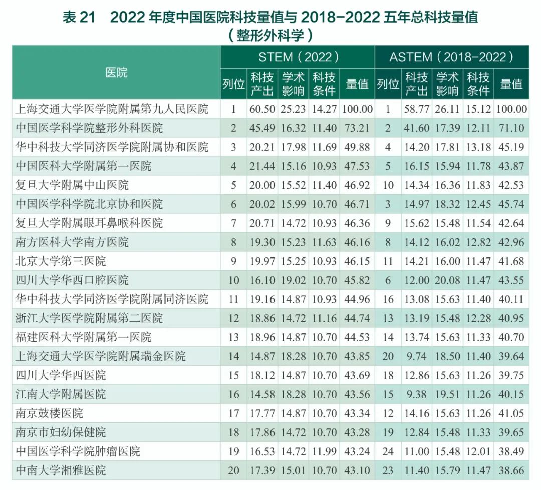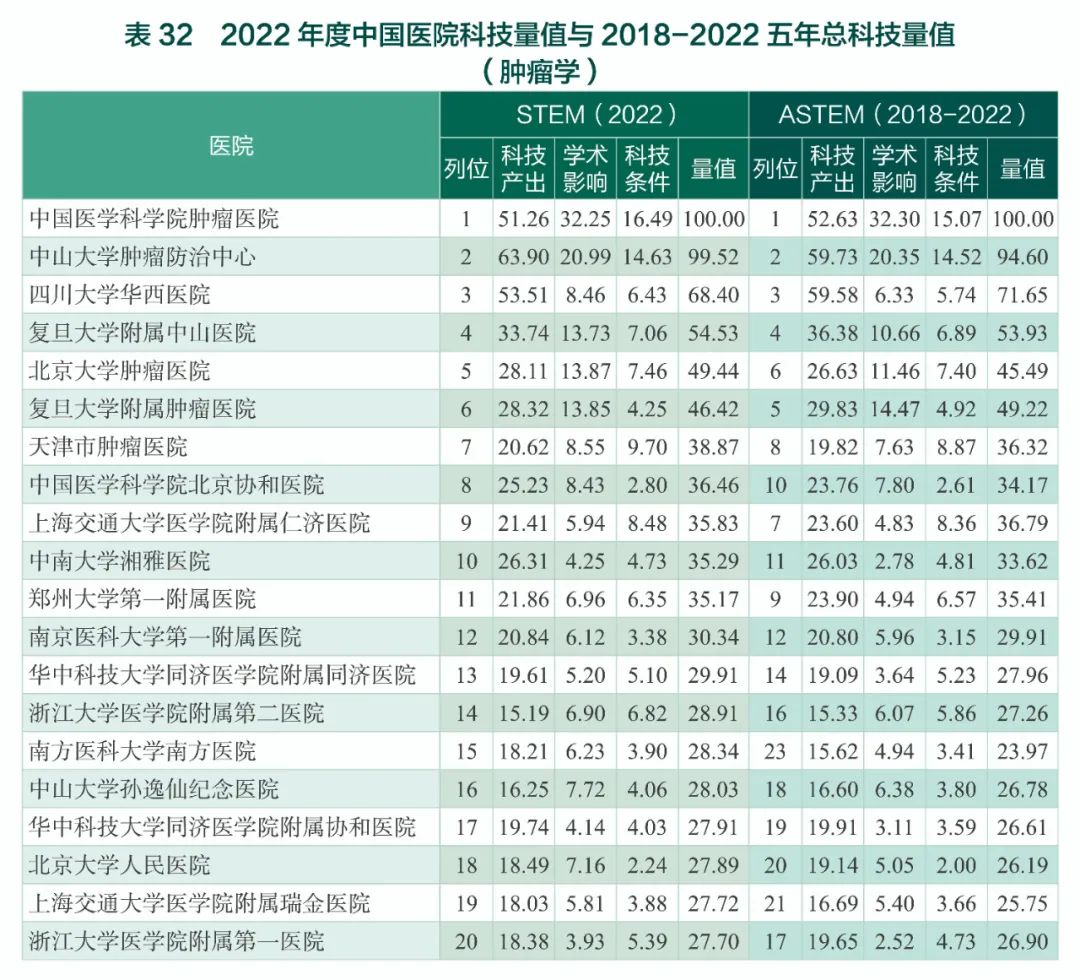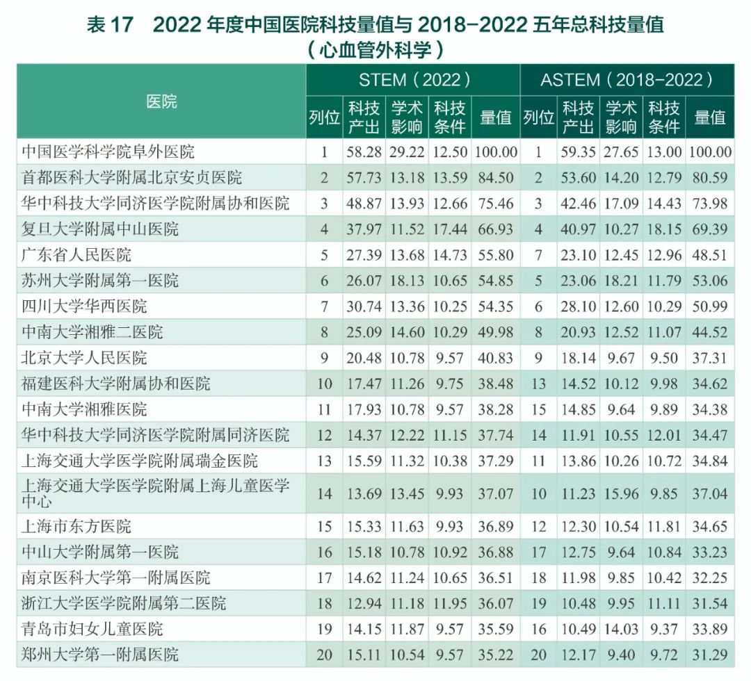 2022年度中国医院科技量值研究对象覆盖全国1,644家三级医院,此次发布综合及31个学科前100位医院。综合科技量值列位前10的医院分别是:四川大学华西医院、中国医学科学院北京协和医院、复旦大学附属中山医院、华中科技大学同济医学院附属同济医院、浙江大学医学院附属第一医院、北京大学第三医院、华中科技大学同济医学院附属协和医院、中南大学湘雅医院、上海交通大学医学院附属第九人民医院、中国医学科学院肿瘤医院。