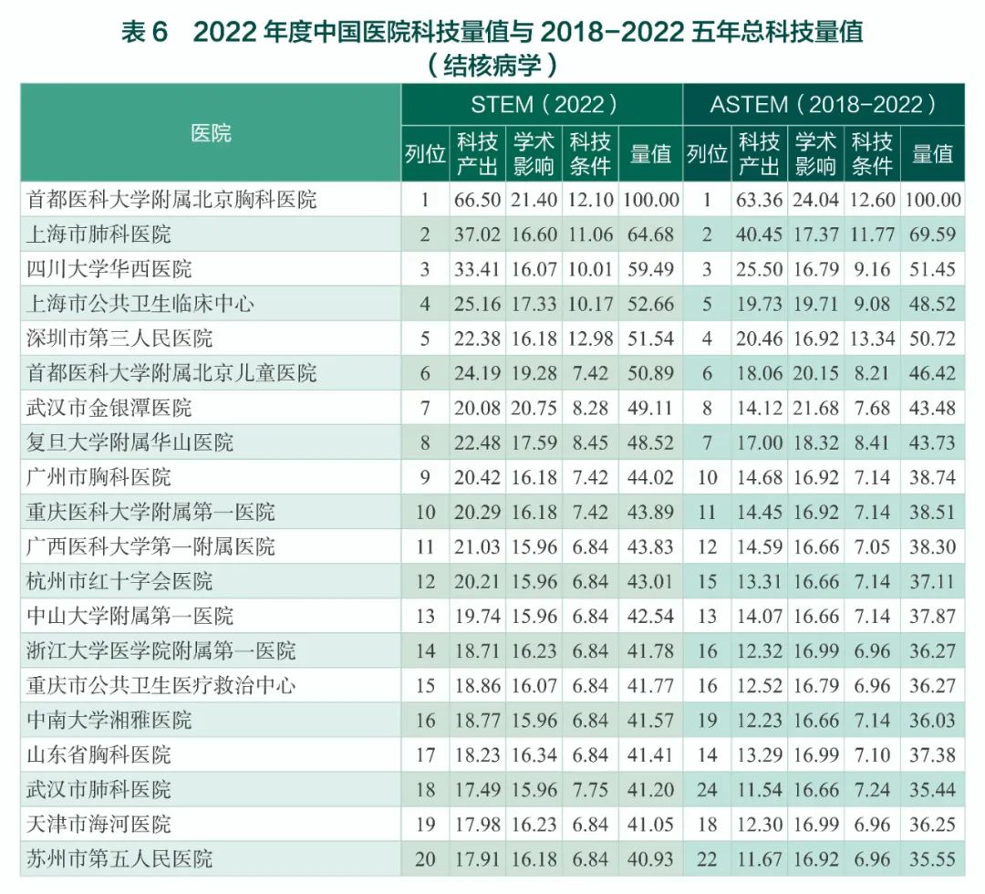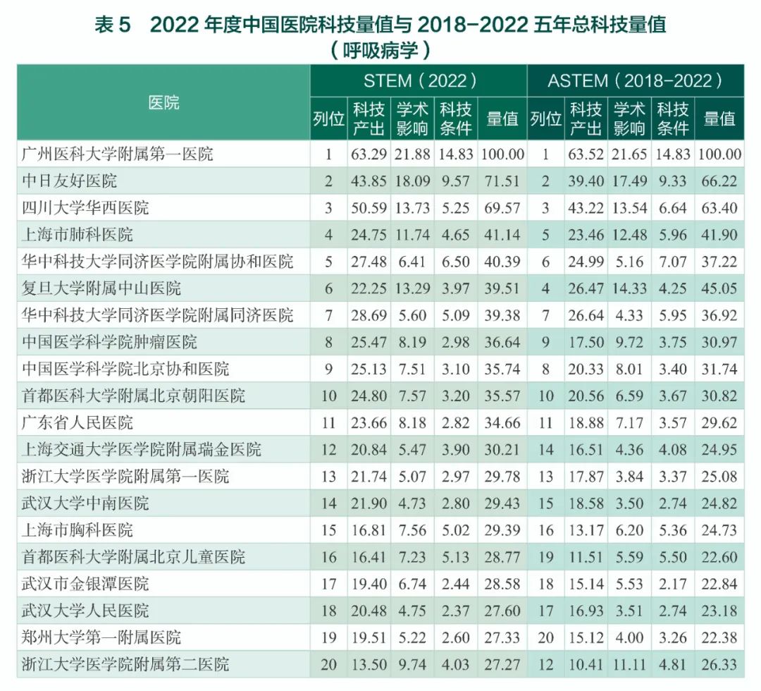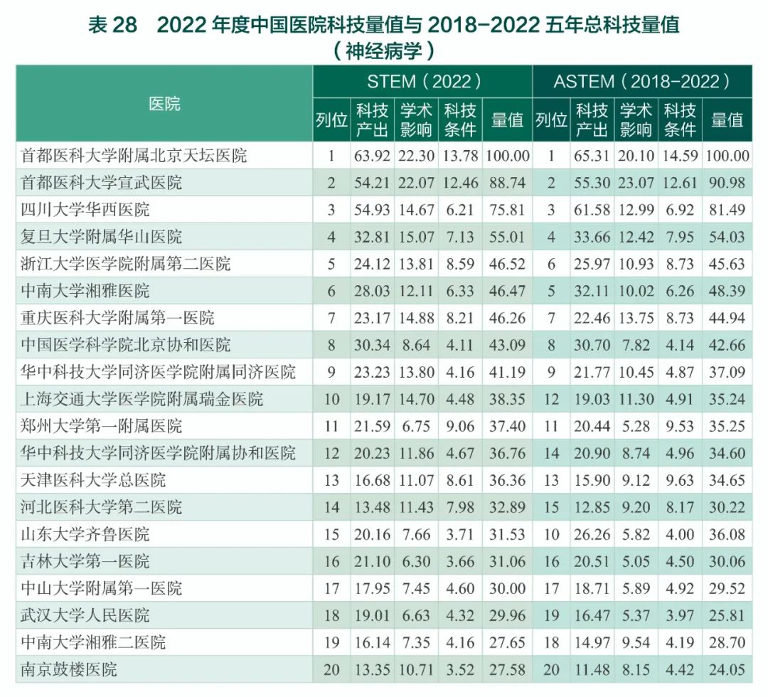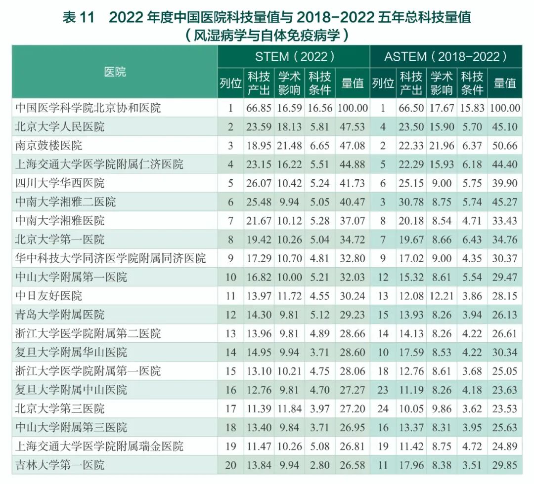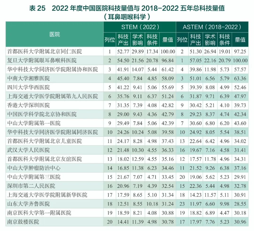 2022年度中国医院科技量值研究对象覆盖全国1,644家三级医院,此次发布综合及31个学科前100位医院。综合科技量值列位前10的医院分别是:四川大学华西医院、中国医学科学院北京协和医院、复旦大学附属中山医院、华中科技大学同济医学院附属同济医院、浙江大学医学院附属第一医院、北京大学第三医院、华中科技大学同济医学院附属协和医院、中南大学湘雅医院、上海交通大学医学院附属第九人民医院、中国医学科学院肿瘤医院。
