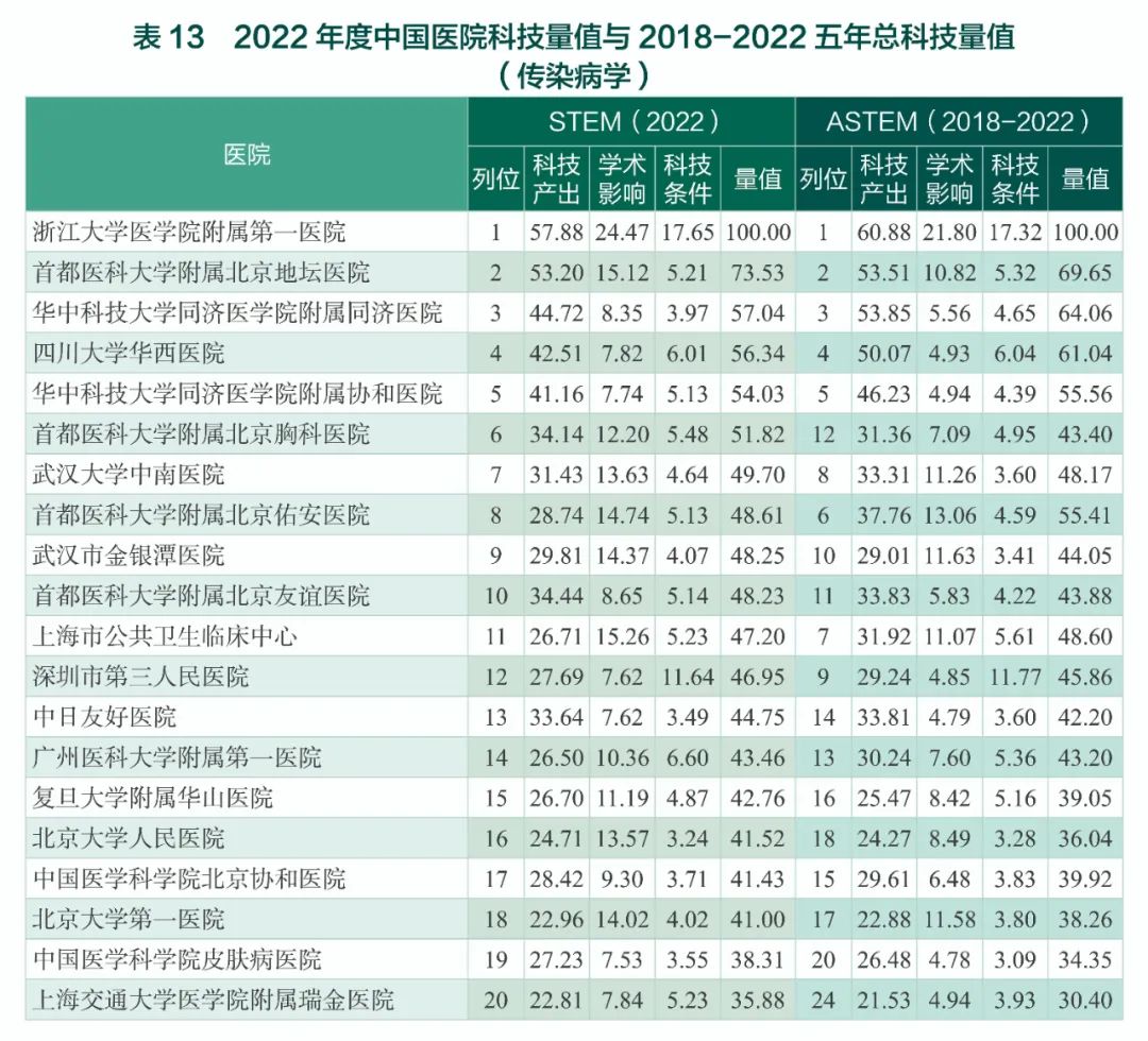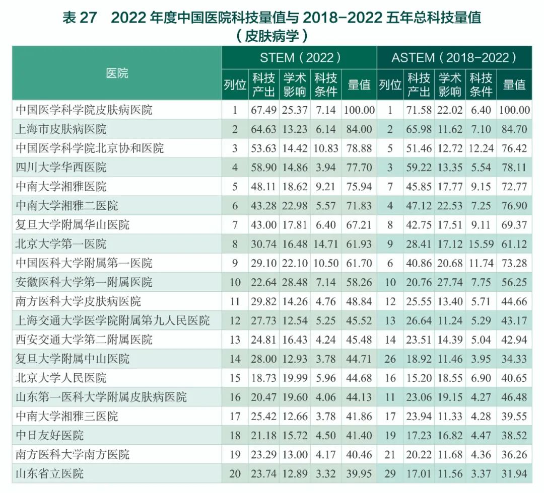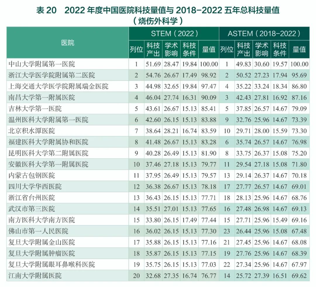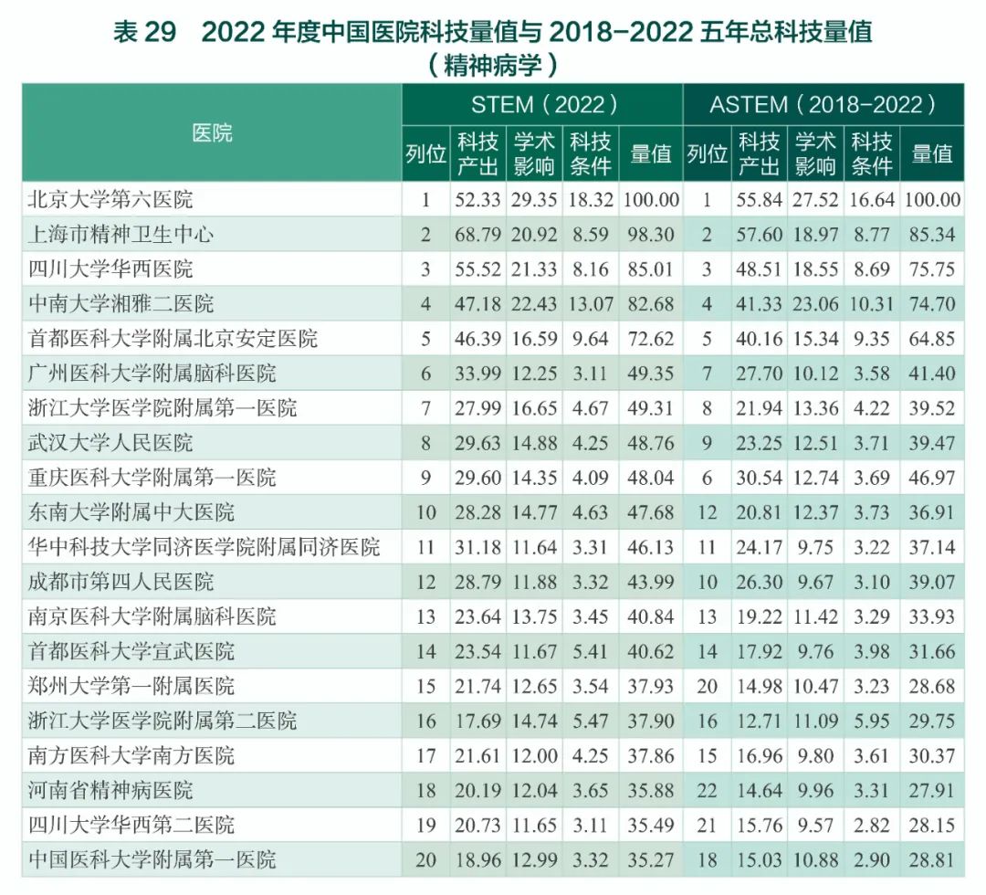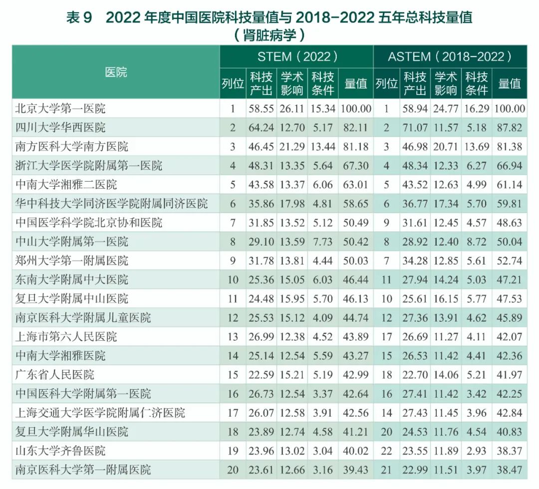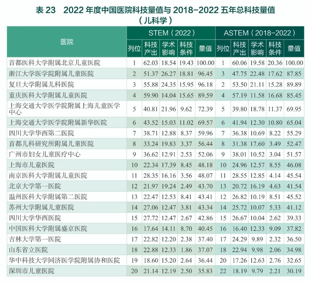 2022年度中国医院科技量值研究对象覆盖全国1,644家三级医院,此次发布综合及31个学科前100位医院。综合科技量值列位前10的医院分别是:四川大学华西医院、中国医学科学院北京协和医院、复旦大学附属中山医院、华中科技大学同济医学院附属同济医院、浙江大学医学院附属第一医院、北京大学第三医院、华中科技大学同济医学院附属协和医院、中南大学湘雅医院、上海交通大学医学院附属第九人民医院、中国医学科学院肿瘤医院。