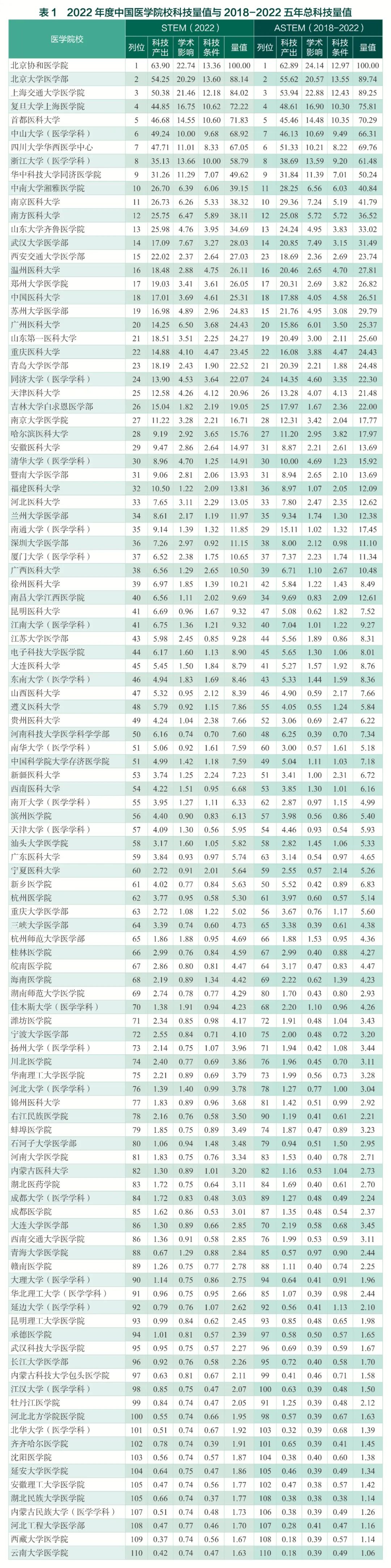 2022年度中国医学院校科技量值研究对象覆盖全国110所独立医学院校和设立医学学科的综合大学。综合科技量值列位前10的医学院校分别是:北京协和医学院、北京大学医学部、上海交通大学医学院、复旦大学上海医学院、首都医科大学、中山大学(医学学科)、四川大学华西医学中心、浙江大学(医学学科)、华中科技大学同济医学院、中南大学湘雅医学院。
