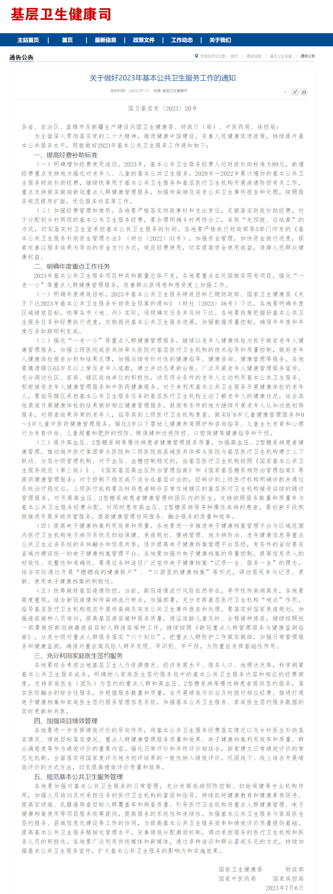 据国家卫健委网站消息,国家卫健委等4部门发布关于做好2023年基本公共卫生服务工作的通知,明确增加经费使用途径。2023年,基本公共卫生服务经费人均财政补助标准为89元,新增经费重点支持地方强化对老年人、儿童的基本公共卫生服务。2020年—2022年累计增加的基本公共卫生服务财政补助经费,继续统筹用于基本公共卫生服务和基层医疗卫生机构开展疫情防控有关工作,重点支持做实做细新冠重点人群健康管理服务,加强传染病及突发公共卫生事件报告和处理,按照服务规范提质扩面,优化服务内容等工作。